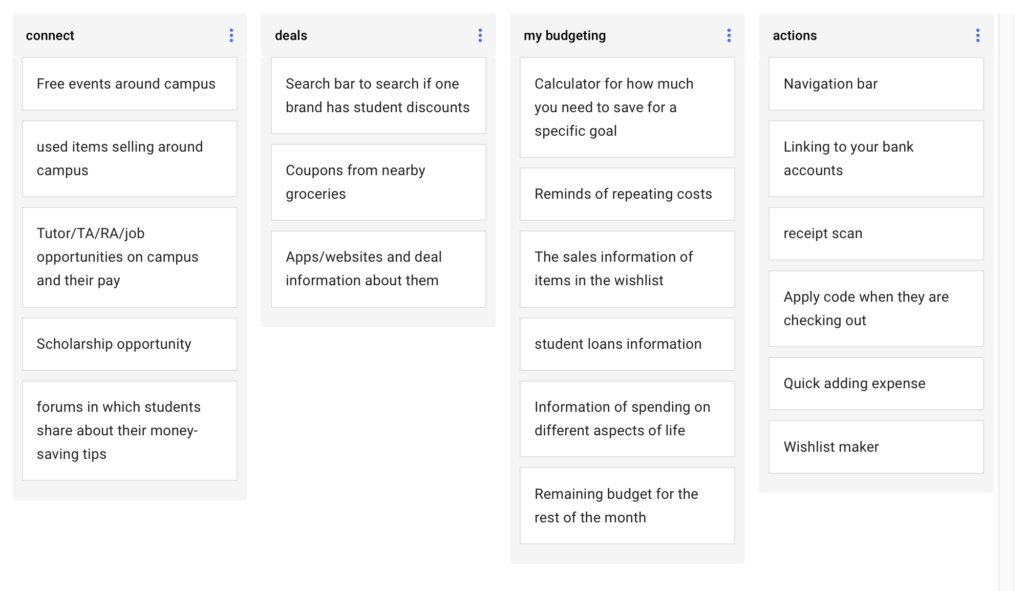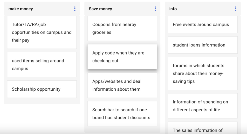 As a college student myself, I am afraid that I would be biased by this fact by paying attention to only my personal needs instead of truly putting myself into others’ shoes. That’s why I carried out 2 listening sessions to understand how other college students interact with money and their experiences saving money.