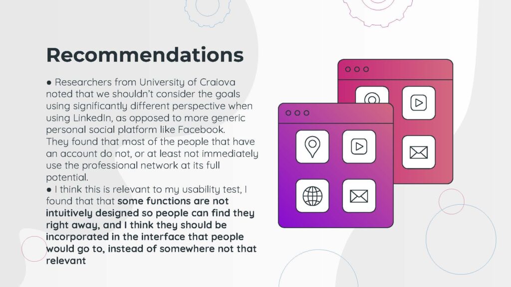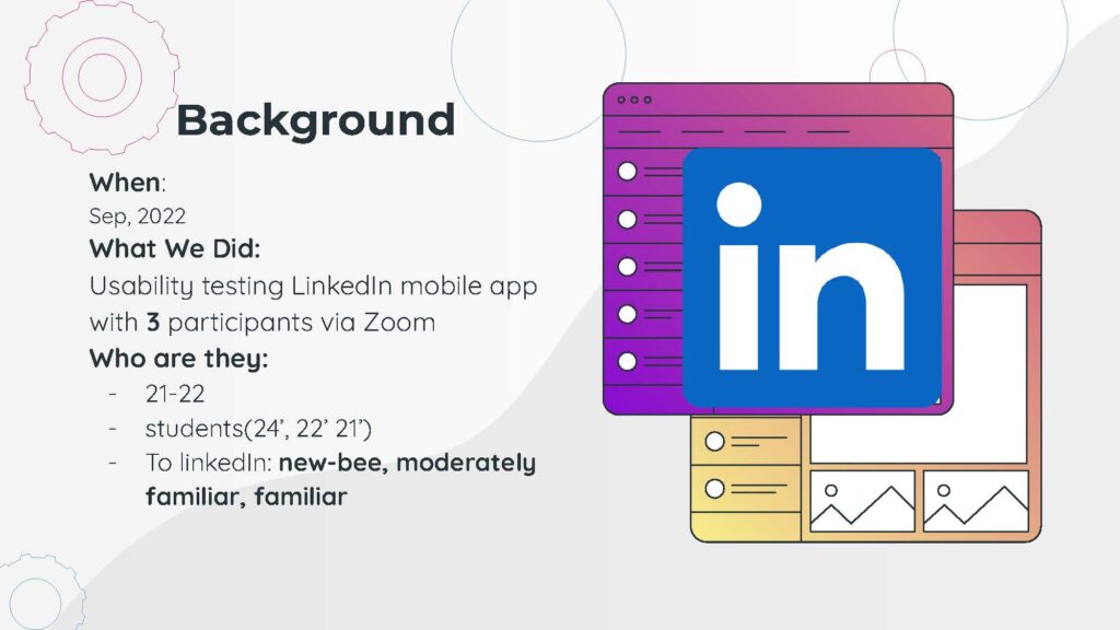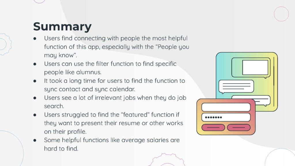 The next thing I did was usability testing with the LinkedIn Mobile app with 3 users with different levels of familiarity with the LinkedIn mobile app. The functions of my app are quite different from LinkedIn but one important insight I can gain from it would be how to appropriately incorporate a lot of different functions in an app. I paid special attention to smooth navigation from page to page when I was designing my app.